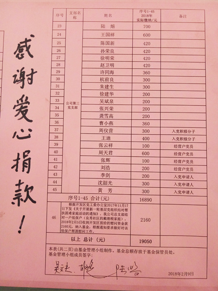 為繼續(xù)做好新一年度愛心基金工作,公司黨總支從2月5日-12日期間開展了2018年度公司“黨員慈善愛心基金”捐贈工作,得到了全體黨員、入黨積極分子、黨員經(jīng)營戶和入黨申請人的熱烈響應(yīng),黨總支屠書記率先獻愛心,共有45位同志踴躍捐款共計16890元,連同開發(fā)區(qū)下拔的結(jié)對困難戶慰問資金2160元,總計19050元匯入公司“黨員慈善愛心基金”池,開展2018年度向困難戶等扶弱濟困慰問工作。