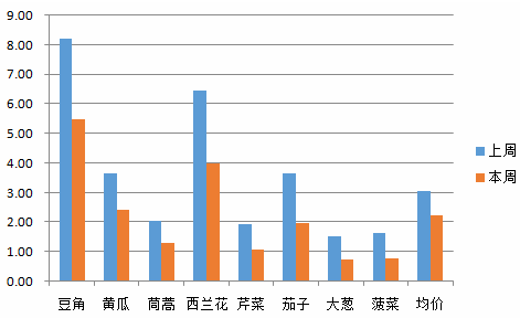 豆角環(huán)比下降33.16%,黃瓜環(huán)比下降33.98%,茼蒿環(huán)比下降36.81%,西蘭花環(huán)比下降38.05%,芹菜環(huán)比下降44.12%,茄子環(huán)比下降46.09%,大蔥環(huán)比下降50.93%,菠菜環(huán)比下降53.45%