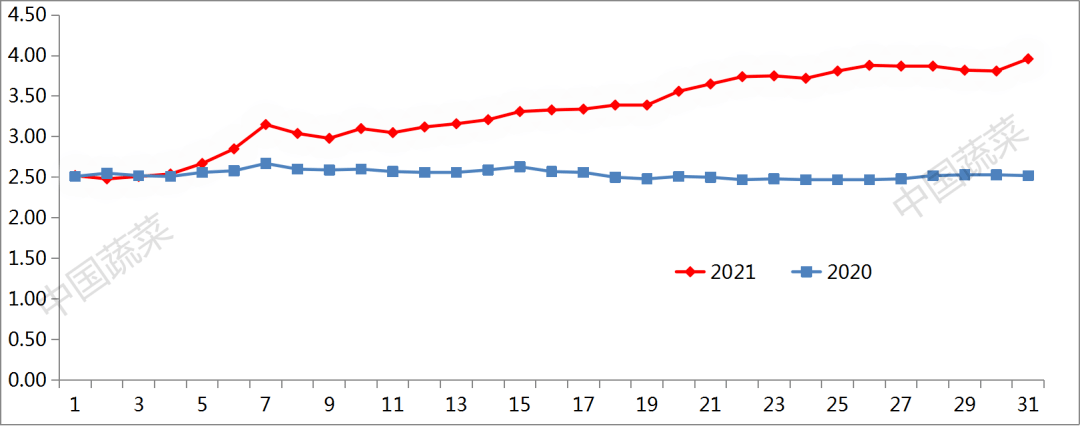 月內(nèi)的最高價(jià)是3.96元/公斤(10月31日),月內(nèi)的最低價(jià)是2.48元/公斤(10月2日),比9月份的2.26元/公斤上漲9.73%。最高價(jià)比最低價(jià)高出59.68%,月內(nèi)的最低價(jià)出現(xiàn)在月初,最高價(jià)出現(xiàn)在月末,說明10月份蔬菜價(jià)格整體呈現(xiàn)連續(xù)上漲的態(tài)勢,漲幅巨大。